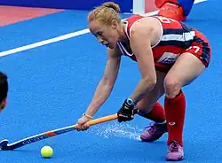 By 2012, Crandall was named team captain.[12] The team finished a disappointed 12th place out of 12 teams at the 2012 Summer Olympics in London. Crandall scored a goal against Germany in the team's opening game.[5] Having failed to qualify for the 2010 World Cup, the team finished fourth in the 2014 World Cup.[5][6] Crandall was part of the US Team that repeated as gold medal champion at the 2015 Pan American games and won the bronze medal at the 2016 Champions Trophy. The team went into the 2016 Summer Olympics ranked fifth in the world, the highest ever ranking for the program.[3] Crandall was again part of the U.S. team for the 2016 Summer Olympics in Rio de Janeiro, her third Olympic games with the team. The team placed 5th overall.[2][9]