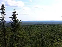 The area is a temperate broadleaf and mixed forests biome transition zone between the true boreal forest to the north and the Big Woods and Carolinian forest to the south, with characteristics of each. It has areas of both broadleaf and conifer forest cover, and bodies of water ranging from lakes to conifer bogs and swamps.[1] Conifers include pines, spruces, firs, and junipers; deciduous types include aspens, paper birches, mountain ash and maples.[2][3] It is often said to have a distinct smell, which is attributed partially to the presence of sweet fern and balsam poplar.