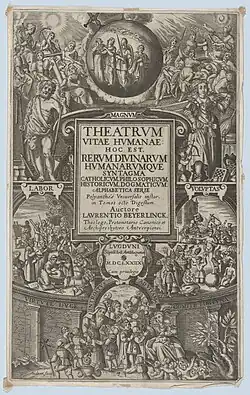 His works are mainly encyclopedic. He wrote, e.g. a second volume (Antwerp, 1611) of the Opus Chronographicum orbis universi a mundi exordio usque ad annum MDCXI (first volume to year 1572 by Opmeer), a collection of lives of popes, rulers, and illustrious men; and the Magnum Theatrum Vitae Humanae (Cologne, 1631, 7 vols; Lyon 1665-6, 8 vols; Venice, 1707, 8 vols), an encyclopedia of information on diverse subjects arranged in alphabetical order. Its scope ranges from theological dissertations to trivialities. It includes articles on beards,[2] and on games.[3] Much of its material was gathered by others, most notably Theodor Zwinger's Theatrum Humanae Vitae,[4] but Beyerlinck gave the work its final form. Other publications are listed in bibliographies.