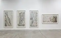 From the early 2000s onward, Walker’s output as an artist and career profile diminished after she was struck by Chronic Fatigue Immune Dysfunction Syndrome (CFIDS). Walker’s last decade of life was lived in seclusion in Montreal, looking for a cure for CFIDS. According to her obituary, even as Walker’s illness negatively impacted her capacity to work, she developed hypotheses and made contributions to research into the origins of CFIDS.[9] While chronically ill, from 2005-2008, Walker completed a set of four large-scale drawings entitled Prometheus Rebound which were exhibited at Susan Hobbs Gallery in Toronto after her death in 2011. The catalog for that show states: "Walker’s work held a high degree of fabrication, and was deliberately made from materials carrying weighty symbolic charges that echoed her deep interest in the natural sciences, ancient mythology, and environmental concerns. Her journals are a testament to her thorough research on these topics while also containing some ruminations on the chronic illness that affected the last years of her life and her more recent work.".[10] As stated in NOW magazine: "Walker’s last drawings are a window into an eclectic and unique art practice that compressed weighty conundrums into elegant images."[11]