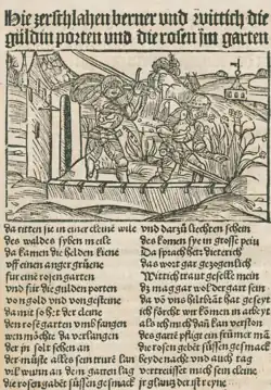 The choice to compose the poem in rhyming couplets rather than the stanzaic form typical for German heroic poetry means that the Laurin is written in the form typical of courtly romance.[17] The manner in which Dietrich sets out to fight Laurin is also very reminiscent of that genre, while the destruction of the garden has parallels to Chrétien de Troyes's Yvain and Hartmann von Aue's Iwein.[32] In this context, Dietrich's near refusal to spare Laurin must appear very negative, as must Dietrich and his heroes' newfound respect for Laurin once they discover he has kidnapped Künhilt.[33] Laurin himself indicates that he considers the destruction of his rose garden a breech of law, by which Witege especially is placed in a bad light.[34] The poem can be seen to deal with the senselessness of such knightly adventure.[35] Nevertheless, Laurin's characterization becomes increasingly negative as the poem progresses, although he is never shown to be entirely evil.[36] The various reworkings try to solve some of these ambiguities: in the Dresdner version, Laurin appears evil from the beginning; in the Walberan version, the humanity and dignity of the dwarf is instead placed in the foreground, causing Dietrich to spare him and suggesting that Dietrich was wrong to attack the rose garden.[37]