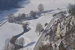 The Lauter (German pronunciation: [ˈlaʊtɐ] ), also known as Große Lauter (lit.'Big Lauter'), is a small river of the Swabian Alb, Baden-Württemberg, Germany. Its karst spring is inside the walls of the former nunnery at "Offenhausen", a small settlement near Gomadingen. The river discharges into the Danube after 42 km. The river has a long geological history since late Miocene. Although the Swabian Alb is heavily karstified, this river's water runs aboveground all the way.