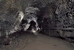 The Lava River Cave was created by lava flowing downhill from a volcanic vent. The lava flowed northwest from the vent toward the Deschutes River. The flow began as a river of lava flowing in an open channel. Eventually, a lava crust solidified over the top of the flowing lava. This formed a roof over the river, enclosing it in a lava tunnel or tube. When the eruption from the vent stopped, the lava drained out of the tube leaving a lava tube cave behind. After the cave cooled, a section of its roof collapsed. This collapsed section provided the entrance to both the uphill (southeast) and downhill (northwest) cave sections.[1][2]