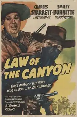 Law of the Canyon is a 1947 American Western film directed by Ray Nazarro and written by Eileen Gary. The film stars Charles Starrett, Nancy Saunders, Robert 'Buzz' Henry, Texas Jim Lewis and Smiley Burnette. The film was released on April 24, 1947, by Columbia Pictures.[1][2][3] This was the twenty-second of 65 films in the Durango Kid series.[4]