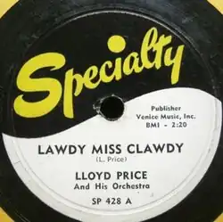 "Lawdy Miss Clawdy" is a song by New Orleans singer-songwriter Lloyd Price that "grandly introduced The New Orleans Sound".[2] It was first recorded by Price in 1952 with Fats Domino and Dave Bartholomew during his first session for Art Rupe and Specialty Records. The song became one of the biggest selling R&B records of 1952 and crossed over to other audiences. "Lawdy Miss Clawdy" inspired many songs and has been recorded by a variety of artists.