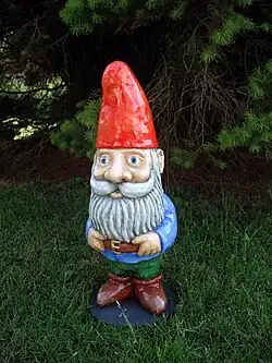 Garden gnomes (German: Gartenzwerge, lit. 'garden dwarfs') are lawn ornament figurines of small humanoid creatures based on the mythological creature and diminutive spirit which occur in Renaissance magic and alchemy, known as gnomes. They also draw on the German folklore of the dwarf.