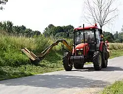 Mowers mounted on a tractor's three-point hitch may be known as finish mowers used for maintaining lawn, flail mowers used for maintaining rough grass on rough surfaces, or brush mowers used for cutting brush and small trees.