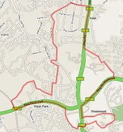 It is bordered by West Park, Adel, Ireland Wood and Holt Park. The A660 Leeds to Otley road runs through the area.