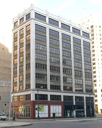 The Lawyers Building was designed in the Chicago School architectural style, and is constructed of reinforced concrete and steel faced with terra cotta. It stands at 10 floors in height, featuring regular bays with grouped wood casement windows with metal spandrel panels.[2] It was one of the few office buildings of the time that strove for modernism over ornamentation.[6] It is currently the finest nearly unaltered Chicago-style highrise in Detroit; the only change made to the building is the modern marble ground-level storefront.[2]