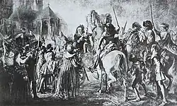 It is difficult to classify the Laying out of the March Fallen as an genre. According to Karin Gludovatz, the painting cannot be attributed to history painting because it does not take a clear position on the historical event. The Laying in State of the March Fallen could be interpreted on the one hand as an expression of homage to the insurgents. On the other hand, the painting refrains from glorifying the battle. It also differs from other revolutionary paintings in that it focuses on the victims and thus does not support a narrative of national identity.[80] The Laying out of the March Fallen was not Menzel's first history painting that subverted the traditional academic rules. The so-called Kassel Cardboard was painted in Kassel as early as 1847/1848 and depicts the entry of Duchess of Brabant into Marburg. However, the central figure in the scene, the founder of the Hesse dynasty, does not stand out from the assembled crowd. The narrative of a hero, which is characteristic of history paintings, is disrupted in this way.[81]