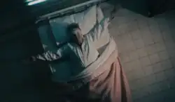 The official music video for "Lazarus", featuring a shorter edit of the song lasting just over four minutes, was uploaded on 7 January 2016 to Bowie's Vevo channel on YouTube.[15] The video was directed by Johan Renck (who also directed the music video for Bowie's previous single, "Blackstar") in November 2015; during the week of shooting, doctors reportedly informed Bowie the cancer was terminal and that they were ending treatment.[16] The filming location was a studio in the New York City borough of Brooklyn.[17] The video is shown in a 1:1 aspect ratio and prominently features Bowie, appearing with a bandage and buttons sewn over his eyes, lying on a deathbed. A director's cut exists restoring the original widescreen aspect.[18]