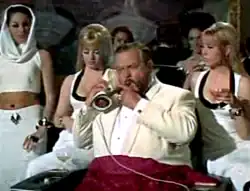 Le Chiffre (Orson Welles) is a secondary villain in the 1967 satire Casino Royale and appears in one of the few segments of the film actually adapted from Ian Fleming's book. As in the novel, Le Chiffre is charged with recovering a large sum of money for SMERSH after he loses it at the baccarat table. He first attempts to raise the funds by holding an auction of embarrassing photographs of military and political leaders from China, the United States, and the Soviet Union, but this is foiled by Sir James Bond (David Niven)'s daughter, Mata Bond (Joanna Pettet). With no other option, he returns to the baccarat table to try to win back the money. Later, he encounters baccarat Master Evelyn Tremble (Peter Sellers), who has been recruited by Bond to stop Le Chiffre from raising the money. Le Chiffre attempts to distract Tremble by performing elaborate magic tricks, but fails to prevent Tremble from winning. Afterwards, he arranges for Tremble to be kidnapped and subjects the agent to psychedelic torture in order to get back the money. The torture session is interrupted when his SMERSH masters, led by the film's main villain, Dr. Noah (Woody Allen), shoot him dead.