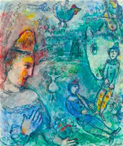 The painting depicts floating clowns amid the circus ring in the middle of the performance.[1] The subject of circus was dear to the artist.[2] Chagall often returned to the circus as a subject matter in his artworks.[3] He considered clowns, acrobats and actors as tragically human beings who are like characters in certain religious paintings.[4]