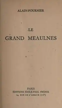 Le Grand Meaulnes (French: [lə ɡʁɑ̃ moln]) is the only novel by French author Alain-Fournier, who was killed in the first month of World War I. The novel, published in 1913, a year before the author's death, is somewhat autobiographical, especially the name of the heroine Yvonne, for whom he had a doomed infatuation in Paris. Fifteen-year-old François Seurel narrates the story of his friendship with seventeen-year-old Augustin Meaulnes as the latter searches for his lost love. Impulsive, reckless and heroic, Meaulnes embodies the romantic ideal, the search for the unobtainable, and the mysterious world between childhood and adulthood.[1]