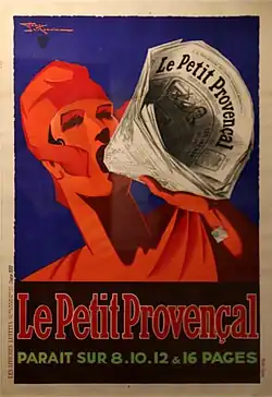 Le Petit Provençal paper called itself a Socialist Republican newspaper, but was never the official organ of the socialists. Between 1890 and 1900 it supported socialist candidates of all camps, including Guesdists. Regular contributors included Alexandre Millerand, René Viviani, Gustave Rouanet, Clovis Hugues and Léon Mirman.[5] André Joseph Lefèvre wrote for Le Petit Provençal in the period before World War I (1914–18).[6] During the period leading up to 1914 the paper emphasized that it supported both radicals and socialists. The circulation was 40,000–50,000 in 1902.[7] While papers at the time usually gave false circulation figures Le Petit Provençal by 1913 probably had a daily circulation of about 100,000. Advertising only filled 20% or so of the pages.[8]