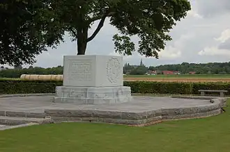 At the end of the war, The Imperial War Graves Commission granted Canada eight sites - five in France and three in Belgium - on which to erect memorials. Each site represented a significant Canadian engagement in the war and for this reason it was originally decided that each battlefield would be treated equally and graced with identical monuments.[1] The Canadian Battlefields Memorials Commission was formed in November 1920 to discuss the process and conditions for a competition that would be held to select the design of the memorial that would be used at the eight European sites.[2] In October 1922, the submission of Toronto sculptor and designer Walter Seymour Allward was selected as the winner of the competition, and the submission of Frederick Chapman Clemesha placed second. The commission selected Vimy Ridge in France as the preferred site for Allward's design as it offered the most dramatic location.[3] Clemesha's 'Brooding Soldier' design was selected for the remaining sites but was later, for a number of reasons, erected only at St. Julien in Belgium. The remaining six sites at Passchendaele and Hill 62 in Belgium and Le Quesnel, Dury, Courcelette and Bourlon Wood in France each received a Canadian granite block memorial marker inscribed with a brief description of the battle they commemorate in both English and French. The blocks are situated in small parks that vary in shape and design and are typically situated on key points of the battlefield they memorialize.