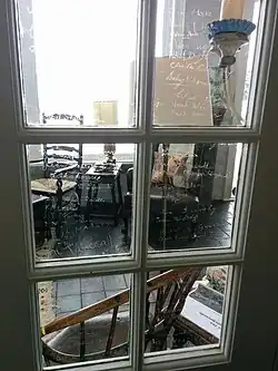Visitors to the house were encouraged to sign the window panes with a diamond-tipped pen. As a result, there are hundreds of signatures on the windows and French doors, many from prominent Canadians. Some of the names include humorist Stephen Leacock, artist Clarence Gagnon and Sir John Abbott.[6]