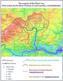 Further north, the newly formed lower Lea was fed by rivers which, as mentioned above, had flowed directly into the proto-Thames prior to the Anglian glaciation. These rivers - the upper Lea, the Mimram, the Beane, the Rib, the Ash and the Stort - today follow courses which are mostly similar to those of their pre-Anglian predecessors.[7]