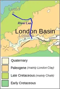 The main underlying geological formation of the upper part of the Lea catchment, north of Hoddesdon, is Cretaceous Chalk. The main underlying geological formation of the lower part of the Lea catchment, south of Hoddesdon, is Eocene London Clay.