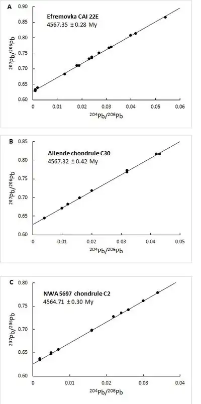 The result of U-corrected Pb–Pb dating has produced ages of 4567.35 ± 0.28 My for CAIs (A) and chondrules with ages between 4567.32 ± 0.42 and 4564.71 ± 0.30 My (B and C) (see figure). This supports the idea that CAIs crystallization and chondrule formation occurred around the same time during the formation of the solar system. However, chondrules continued to form for approximately 3 My after CAIs. Hence the best age for the original formation of the Solar System is 4567.7 My. This date also represents the time of initiation of planetary accretion. Successive collisions between accreted bodies led to the formation of larger and larger planetesimals, finally forming the Earth–Moon system in a giant impact event.