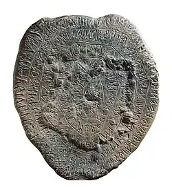 The Lead Plaque of Magliano (or Lead Plate of Magliano or Lead Disk; CIE 5237), which contains 73 words in the Etruscan language, seems to be a dedicatory text, including as it does many names of mostly underworld deities.[1] It was found in 1882, and dates to the mid 5th century BC.[2] It is now housed in the National Archaeological Museum in Florence.[3]
