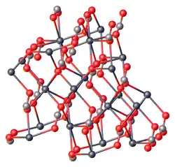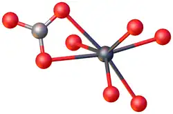 Like all metal carbonates, lead(II) carbonate adopts a dense, highly crosslinked structure consisting of intact CO2−3 and metal cation sites. As verified by X-ray crystallography, the Pb(II) centers are seven-coordinate, being surrounded by multiple carbonate ligands. The carbonate centers are bonded bidentate to a single Pb and bridge to five other Pb sites.[4]