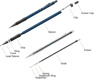 A mechanical pencil or clutch pencil is a pencil with a replaceable and mechanically extendable solid pigment core called a "lead" /ˈlɛd/. The lead, often made of graphite, is not bonded to the outer casing, and the user can mechanically extend it as its point is worn away from use. The vast majority of mechanical pencils have erasers.