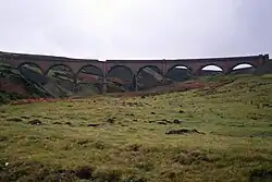 A significant structure on the line was Rispin Cleugh viaduct, built by Sir Robert McAlpine & Co. It was built from concrete and was clad with terracotta bricks to improve its appearance. It was demolished with explosives in 1991.[7]