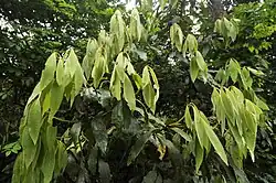 Leaf flushing or leaf out is the production of a flush of new leaves typically produced simultaneously on all branches of a bare plant or tree. Young leaves often have less chlorophyll and the leaf flush may be white or red, the latter due to presence of pigments, particularly anthocyanins.[1] Leaf flushing succeeds leaf fall, and is delayed by winter in the temperate zone or by extreme dryness in the tropics. Leaf fall and leaf flushing in tropical deciduous forests can overlap in some species, called leaf-exchanging species, producing new leaves during the same period when old leaves are shed or almost immediately after.[2][3] Leaf-flushing may be synchronized among trees of a single species or even across species in an area.[4] In the seasonal tropics, leaf flushing phenology may be influenced by herbivory and water stress.[5][6]
