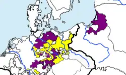 ![]() The Protestant League of Torgau (purple) and the Catholic League of Dessau (yellow) in northern Germany | |