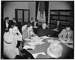 Conservatives who opposed the 1935 National Labor Relations Act accused LWS of conspiring with the National Labor Relations Board (NLRB) and later turned to accusing LWS of being a Communist front.[31] J.B. Matthews accused LWS of being a Communist organization in 1939.[32] Matthews' accusation was also borne out of personal resentment against LWS, which had supported a strike at the Consumers' Research (CR) group that Matthews led.[32] Representative Martin Dies worked with Matthews to charge LWS as an "Un-American" organization under the auspices of the House Un-American Activities Committee (HUAC).[32] Mary Catherine Phillips, who was also associated with CR, accused LWS of being "stooges" of the Communist Party in 1940.[33] These accusations happened in spite of the fact that LWS was always specific about wanting to create a "more inclusive democracy."[34]