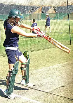 Poulton was selected for the 2010 World Twenty20 in the West Indies and played in every match. With the selection of Elyse Villani to open with Nitschke, Poulton batted at No. 3 in all but one match.[39][40][41][42][43][44][45] In the first warm-up match, she scored one from six balls before being dismissed by Sian Ruck as Australia lost to New Zealand by 18 runs.[39] In the last warm-up match, she hammered 44 from 21 balls including two sixes and then took a catch to remove Armaan Khan as Australians made 5/166 and defeated Pakistan by 82 runs.[40]