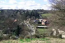 The main village of Lealholm is situated at the bottom of Crunkly Ghyll (sometimes spelled "Crunkley" and "Gill"), a deep cutting where the river emerges into the flat bottom of a glacial U-shaped valley. This was crucial to its development as a settlement, becoming an important crossing point over the River Esk where the valley flattens out, becoming shallow at end of a sharp bend in the river before slowing to a deeper meandering course further downstream. The remains of the fording point are still visible next to the arched bridge used today, which dates back to the 17th century. Three roads lead from the centre of the village, one follows the river up the valley towards Danby; the second heads north past the hamlet of Lealholmside and across the moors towards Whitby; and the third leads south, towards Fryup and Rosedale.[17]