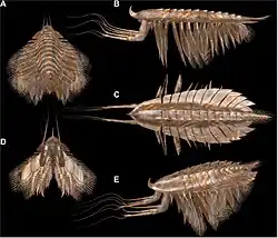 - ^ He, Yu-Yang; Cong, Pei-Yun; Liu, Yu; Edgecombe, Gregory D.; Hou, Xian-Guang (2017). "Telson morphology of Leanchoiliidae (Arthropoda: Megacheira) highlighted by a new Leanchoilia from the Cambrian Chengjiang biota". Alcheringa: An Australasian Journal of Palaeontology. 41 (4): 581–589. Bibcode:2017Alch...41..581H. doi:10.1080/03115518.2017.1320425. S2CID 90593555.