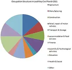 However, as the 2011 census data shows Leathley has changed its industry dependency, according to the 2011 census data under 14 per cent of workers in Leathley Civil Parish are in the agricultural sector, with industries such as finance and education becoming employers in the area.[15]