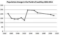 The Parish register of 1821 concluded that the township of Leathley had a population of 312 persons.[9] Between the period from the 1821 parish register to the 1921 census the total population of the civil parish of Leathley decreased gradually to 127 persons.[10] However the total population rose between 1921 and 1951 to 241 persons, reaching a high of 245 persons in the 1931 census statistics, as a result of an increase in agricultural industry during this period.[11] Between the period of 1961 to 2011 census data shows that the population of Leathley civil parish has declined gradually from 214 persons to 181.[12] As shown in the Parish of Leathley total population time series graph.
