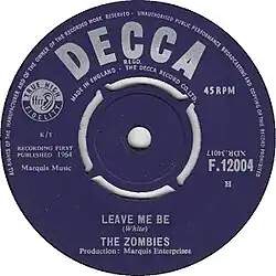 Although recorded during August–September 1964, Decca kept "Leave Me Be" in its vaults until October.[19] This was most likely to allow for a US-release of "She's Not There", which occurred only a few days after the vocal track for "Leave Me Be" was finished, on 7 September through Parrot Records.[1][nb 3] The song proved to be a huge chart success, reaching number two on the Billboard Hot 100 and number one on the Cashbox Top 100.[20][21] As "She's Not There" was more successful in the United States than in the UK, Decca decided to release "Leave Me Be" in the latter territory in order to see whether it would become a hit or not.[19] Therefore, on 16 October 1964, Decca released "Leave Me Be" as the Zombies' second single.[19][nb 4] The B-side chosen was Argent's "Woman", which had been recorded during the same sessions as the A-side.[10][19]