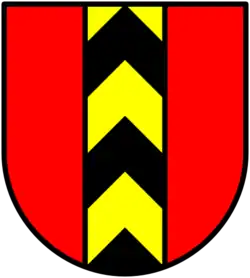 The blazon of the municipal coat of arms is Gules a Pale chevrony Or and Sable.[4]