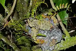 Lecanopteris carnosa is a species of tropical fern in the genus Lecanopteris (family Polypodaceae) native to Borneo, Malaysia, the Philippines, Sumatra, and Sulawesi.[1][2] An epiphyte, its thick, fleshy rhizome forms hollow spaces up to 15 cm (6 in) thick that act shelter for ants,[3] making this a myrmecophyte as well as a succulent[4] similar to others in this genus.[5]