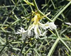 Lechenaultia divaricata is an erect subshrub that typically grows to a height of up to 100 cm (39 in) and has many spreading branches and glabrous foliage. The leaves are reduced to scattered, membrane-like, triangular scales 1–3 mm (0.039–0.118 in) long. The flowers are arranged singly on the ends of branchlets, the sepals 1.5–2.0 mm (0.059–0.079 in) long. The petals are creamy-white to yellow, 13–20 mm (0.51–0.79 in) long, the wings on the lower petal lobes triangular, 1.5–2.5 mm (0.059–0.098 in) wide and fringed, on the upper lobes up to 0.4 mm (0.016 in) wide. Flowering occurs sporadically throughout the year and the fruit is a cylindrical capsule 9–32 mm (0.35–1.26 in) long.[3][4][5][6]