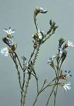 Lechenaultia heteromera, commonly known as claw leschenaultia,[2] is a species of flowering plant in the family Goodeniaceae and is endemic to the south-west of Western Australia. It is a subshrub with a few wand-like branches, fleshy leaves, and white and pale blue flowers.
