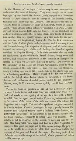 Jean Baptiste Christophore Fusée Aublet (1720–1778) first described Lecythis zabucajo as a result of his two-year stay in French Guiana between 1762 and 1764, when he held the office of Apothecary Botanist. During this period he gathered material for his book Histoire des Plantes de la Guyane Françoise which was published in 1775. Aublet's ill-health cut short his stay in Guiana, and after a brief stay in Haiti he returned to Paris in 1765.[4]