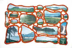 In early 2000s there was an emergence of "morulas" which are works made of many layers of fabric.[7] During this time Catunda began to use personal images in her work by silk-screening them onto the fabric that she worked with.[7] She used images of her friends and family through this method in multiple works including Todo o Pessoal (2006) and Todo o Pessoal II (2008).[7] Additionally, in a 2007 piece titled Mundo Macio, Catunda used scraps of fabric printed with images of nature to create a wall tapestry.[7] In this work she cut the fabric with images into organic shapes and connected these shapes with strings of orange fabric (as seen to the right).[7] Throughout her career she continues to investigate topics such as critiques to consumerism in capitalist society, ironic approaches to society's everyday archetypes, use of heterodox materials, and the exploration of the frontier between painting and objects.[6] Leda has had many exhibitions throughout her career so far. One of her most well known exhibitions is titled I love you baby and took place in 2016.[8] This exhibition was shown in Instituto Tomie Ohtake in Sao Paulo Brazil.[8] This exhibit was an 88 piece collection.[9] In an interview, Leda explains that the exhibition "revolves on the subject matter of emotional consumerism related specifically to affection in those who search for things and images that in turn defines their own identity."[9] This exhibition centered around the "selfie", a tool that Leda views as the most blatant declaration of self-centered love of all time.[9] The show curator interprets the art as a comment on the global behavior of today's ritualized romance and hank-panky ego-trip by explaining that Catunda "has led her oeuvre to embrace the potent resonance inhabited by 'image-people' hysterically dedicated to their looks, shooting photos of themselves in the mirror and posting them online."[9]