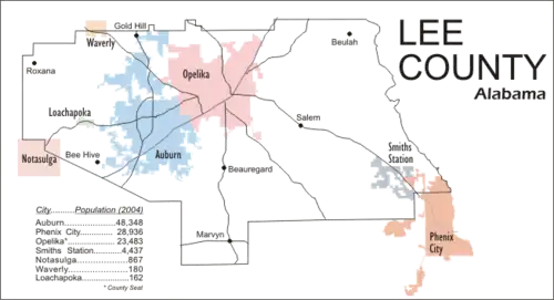 Lee County is a county located in east central Alabama. As of the 2020 census the population was 174,241.[1] The county seat is Opelika,[2] and the largest city is Auburn. The county was established in 1866 and is named for General Robert E. Lee (1807–1870), who served as General in Chief of the Armies of the Confederate States in 1865.[3] Lee County comprises the Auburn-Opelika, AL Metropolitan Statistical Area, which is included in the Columbus-Auburn-Opelika, GA-AL Combined Statistical Area.