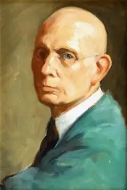 Richards was known best for his portraiture, but he also painted landscapes. Some of his murals are featured inside the Utah Capital Building.[2] He worked alongside Alma B. Wright in 1916 to paint the mural "Utah Lake" on a wall of the capital.[3] He also painted portraits of Utah governors, featured in the Hall of Governors. These portraits included governors William Spry, Charles Rendell Mabey, and Herbert Brown Maw.[4] The Rotunda in the Utah capital building was left unfinished for many years until the Public Works of Art Project (PWAP) funded art commissions for the Capitol.[5] He also finished a mural "Great Men of Knowledge"[6] in 1940 in the University of Utah Park Building which was modified in 2000 due to the objections of Muslim student of it depicting Muhammad.[7] Richards planned and sketched the paintings, and then worked with artists Gordon Cope and Henry Rasmussen to complete the project.[8] The paintings were completed in 1934 and installed in the Capitol the following year to mark the opening of the Utah Arts Institute annual exhibition.[9] Richards painted portraits of many presidents and leaders of the LDS Church, a number of which are now displayed in the Church History Museum in Salt Lake City, murals for the Cardston Alberta Temple,[10] and one for the Mesa Arizona Temple.[11] The Utah Museum of Fine Arts has a large collection of his portraits and murals.[12] In 1921 Richards was the only American to serve as a judge at the Salon d'Automne.