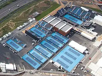 During the London 2012 Olympic and Paralympic Games, Eton Manor was the only purpose-built Paralympic venue. It hosted the wheelchair tennis. The venue comprised nine competition courts and four warm-up courts.[5] There were a total of 10,500 seats for spectators, with a 5,000 capacity centre court. The 27-acre site also housed temporary training pools for participants in aquatics events, including three 50m pools for swimmers and smaller pools for synchronised swimmers and water polo competitors.