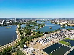 After being stored in the above reservoirs the water is piped to the Coppermills Water Treatment Works to be treated.[8] In 2006 a smaller water treatment works was also built at Chingford at the edge of the William Girling and King George V reservoirs.[9]
