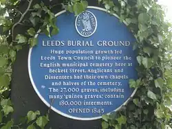 Leeds Civic Trust started its blue plaque scheme in 1987 and by March 2020 2019 it had 180 plaques.[14] They can be suggested by the public and sponsored by organisations. Before commemorating a person or building, it is given objective evaluation against specific criteria to ensure it is of high significance.[15] The Blue Plaques record the impact of significant persons in the city's history. The first plaque, the Burley Bar Stone, was unveiled in November 1987 marking one of the medieval gates of Leeds, the stone itself surviving within the building of the Leeds Building Society on Albion Street.[16] The West Bar and East Bar were also marked, and in 2017 the 164th plaque marked the North Bar.[17] All plaques are monitored by members and those in very poor condition are returned to the manufacturer for repainting.[4]