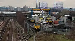 Leeds Midland Road depot was opened in 2003 by London & North Western Railway (LNWR) as a maintenance facility to maintain the Freightliner Class 66 fleet under a ten-year contract.[2][3][4][5] and was located on the former Balm Road sidings that had been used to offload quarry products.[6] LNWR were contracted to maintain up to 30 class 66 locomotives that worked in the Yorkshire area at the site, with heavier maintenance being carried out by Electro-Motive.[4] In 2006, Freightliner Maintenance Limited (FML) was formed and assumed control of operations at Leeds.[7] FML is a subsidiary of the Freightliner Group and was instituted when the number of locomotives and wagons the company leased or owned increased with an upsurge in traffic.[8] Besides being a central point for maintaining the class 66 and Class 70 fleets, both classes are based from here and the facility undertakes wagon maintenance.[1]