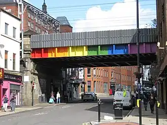 Buildings on the parade route often have temporary decorations in the colours of the Rainbow flag. In 2017, the railway viaduct over Lower Briggate was painted in these colours and named 'Freedom Bridge" by Leeds City Council and Network Rail.[8] Steps going up to the station are also painted in the same colours as is a telephone box (an aql wi-fi hub, close to their headquarters) on Bridge End.